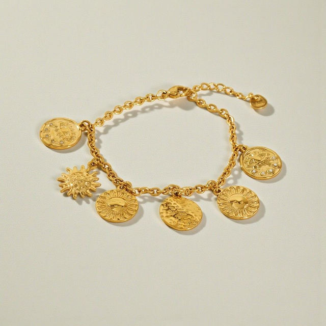 Un bracelet délicat et lumineux, composé d’une chaîne dorée ornée de breloques rondes raffinées. Minimaliste et élégant, il capte la lumière avec subtilité et apporte une touche sophistiquée à votre poignet, idéal à porter seul ou en accumulation.