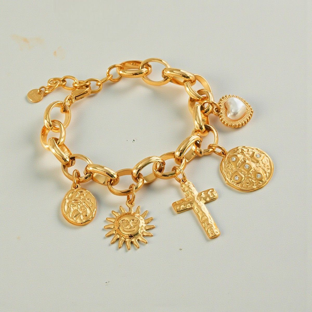 Un bracelet raffiné et lumineux, composé d’une chaîne dorée ornée de pendentifs martelés. Élégant et texturé, il capte la lumière à chaque mouvement et apporte une touche sophistiquée à votre poignet, parfait à porter seul ou en accumulation.