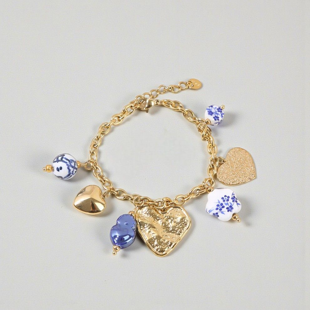 Un bracelet élégant et expressif, composé d’une chaîne dorée ornée de pendentifs bleus et d’une grande plaque cœur martelée. Lumineux et symbolique, il évoque la mer, la force du cœur et une féminité solaire, pour un bijou au caractère affirmé.