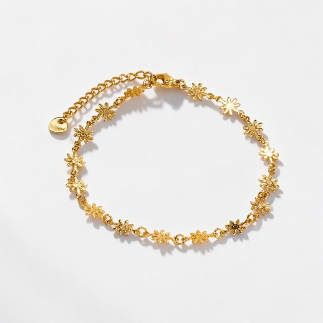 Une chaîne de cheville dorée ornée de petites fleurs au style bohème. Délicate et lumineuse, elle apporte une touche féminine et estivale à vos tenues.
