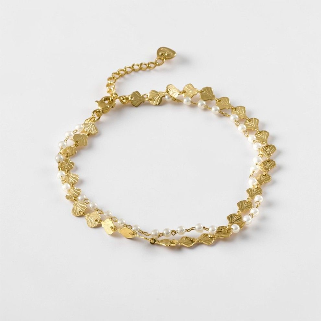Une chaîne de cheville dorée à double rang ornée de coquillages et de perles blanches. Délicate et estivale, elle apporte une touche lumineuse et élégante à vos tenues.