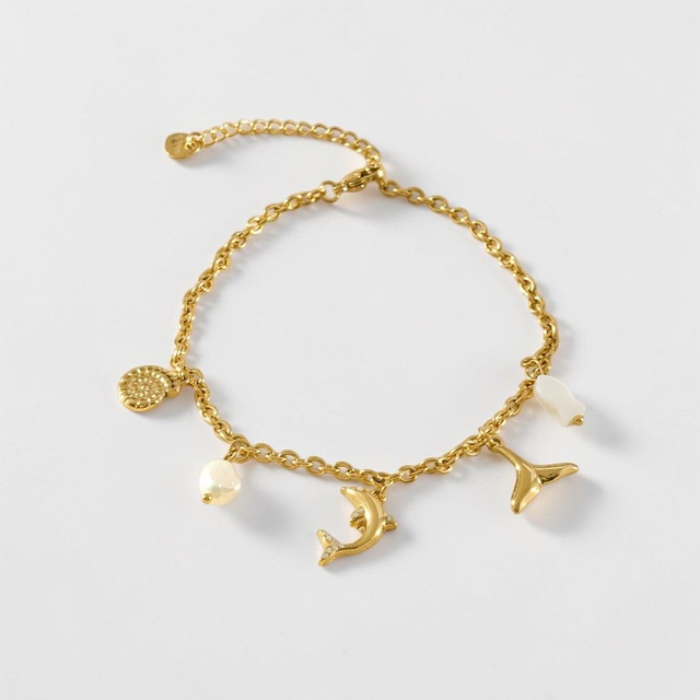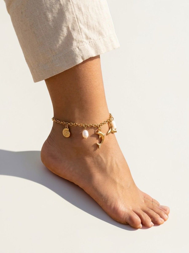 Une chaîne de cheville dorée ornée de breloques d'inspiration océanique. Délicate et estivale, elle apporte une touche fraîche et lumineuse à votre cheville.