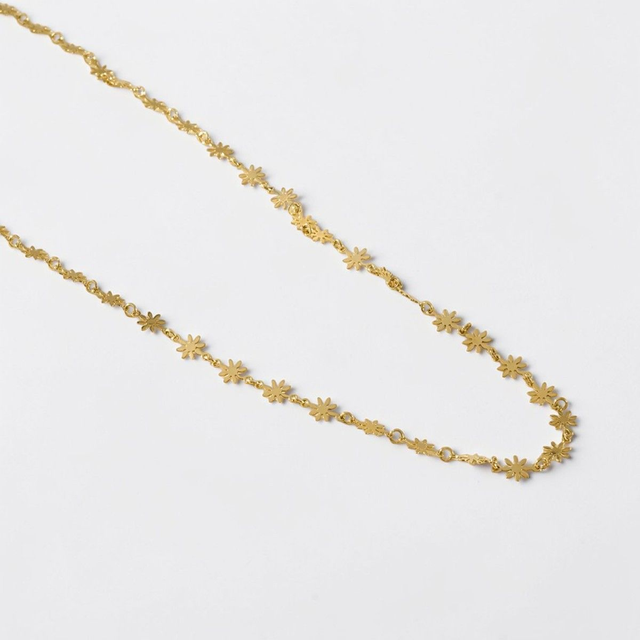 Une chaîne de taille fine ornée de petites fleurs dorées. Délicate et lumineuse, elle sublime la silhouette avec une touche féminine et poétique.