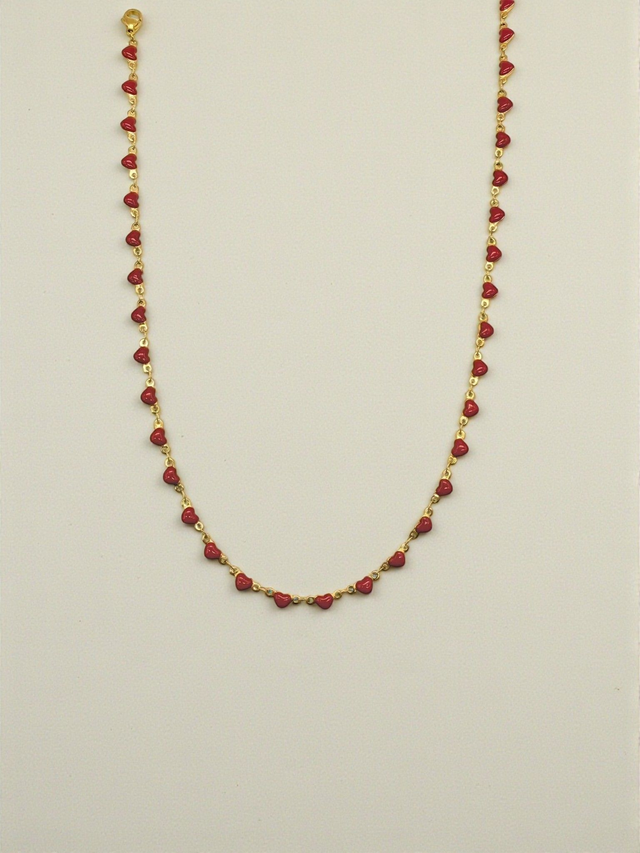 Un collier délicat et expressif, composé d’une chaîne dorée entièrement ponctuée de cœurs rouges lumineux. Féminin et symbolique, il incarne l’amour et la passion, apportant une touche romantique et élégante à toutes vos tenues.