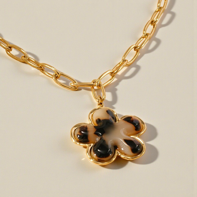 Un collier raffiné au caractère audacieux, composé d’une chaîne dorée sublimée par un pendentif fleur en résine léopard. Féminin et lumineux, il apporte une touche sauvage et élégante à vos tenues, parfait pour affirmer votre style avec subtilité.