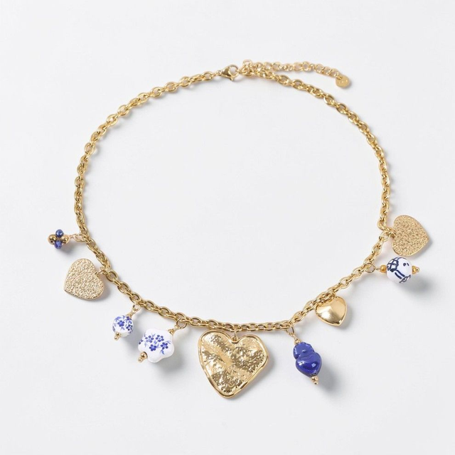 Un collier délicat orné de charms bleus et de cœurs martelés lumineux. Moderne et féminin, il apporte une touche fraîche et raffinée à votre décolleté.