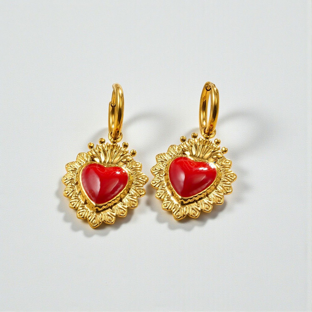De petites créoles élégantes, ornées d’un cœur ex-voto délicatement travaillé et sublimé par un centre rouge lumineux. Féminines et symboliques, elles apportent une touche d’amour et de caractère au quotidien, tout en restant fines et faciles à porter.