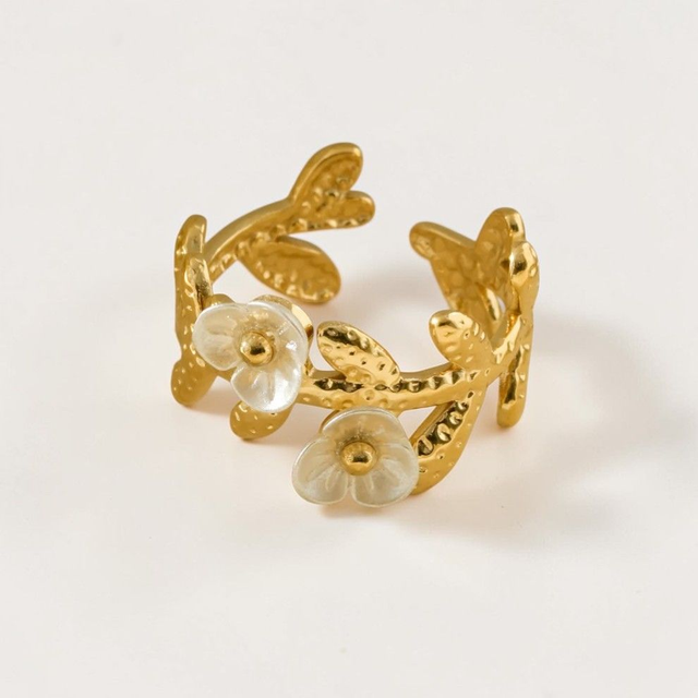 Une bague ajustable ornée de feuillages sculptés et de délicates fleurs nacrées. Féminine et lumineuse, elle apporte une touche douce et raffinée à votre main.